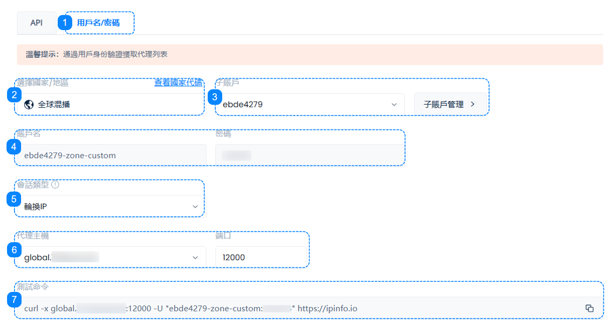 4. 這裏顯示的是您選擇的子賬戶對應的用戶名和密碼信息,用於訪問代理的身份憑證。