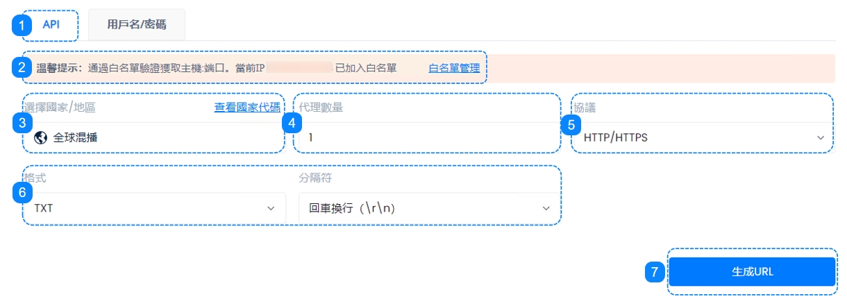 接下來,我們將通過詳細的屏幕截圖和清晰的說明,分別向您展示 API ( IP 白名單) 和用戶名/密碼的代理配置方法。