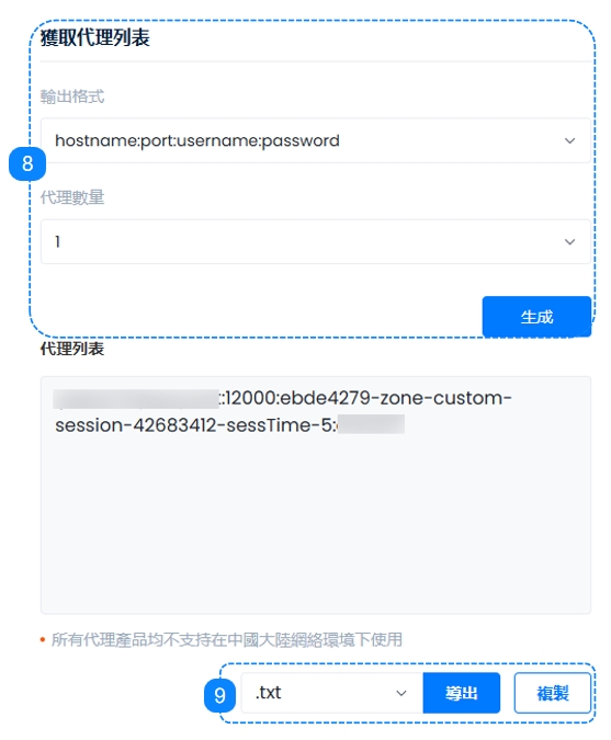 8. 這裡是必不可少的一步,在右側的“獲取代理列表”部分,設置適合我們目標的正確格式以及需要的代理數量,單擊“生成”按鈕後,我們可以在代理列表看到反映上述選擇的具體信息,您可以在代理字符串頁面上了解更多信息。