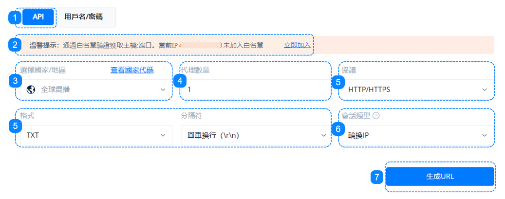 2.將要訪問代理服務的 IP 地址添加到白名單,您可以查看 IP 白名單的快速指南。