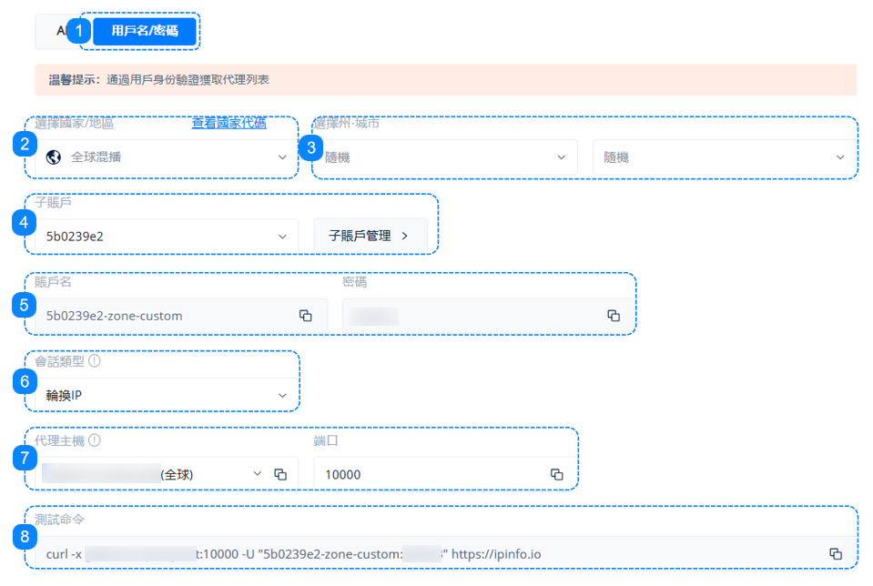 5.這裏顯示的是您選擇的子賬戶對應的用戶名和密碼信息,用於訪問代理的身份憑證。