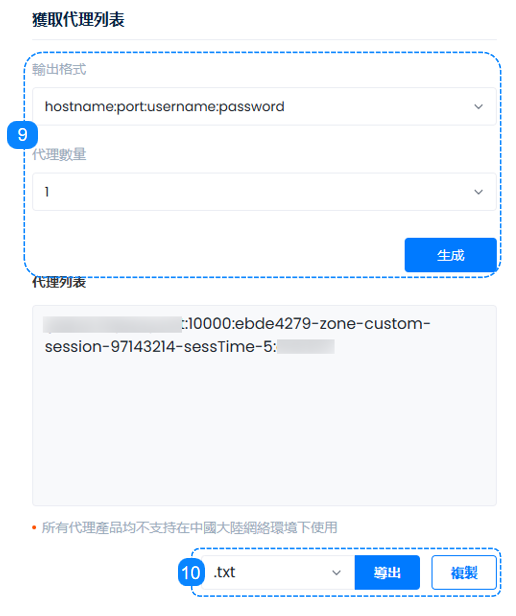 9. 這裡是必不可少的一步,在右側的“獲取代理列表”部分,設置適合我們目標的正確格式以及需要的代理數量,單擊“生成”按鈕後,我們可以在代理列表看到反映上述選擇的具體信息,您可以在代理字符串頁面上了解更多信息。