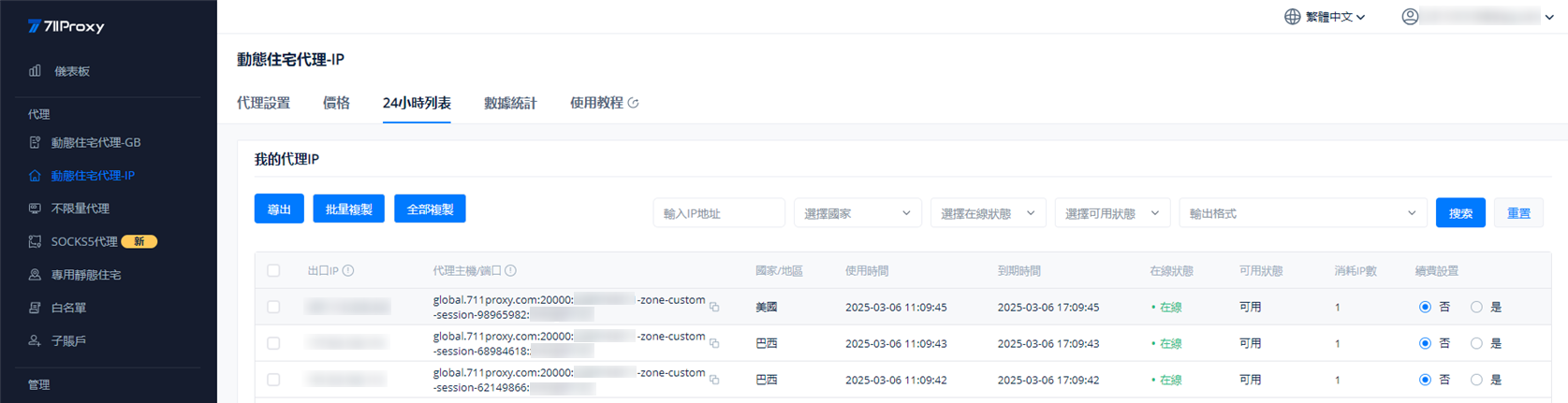 前往 動態住宅代理-IP > 24小時列表 部分。