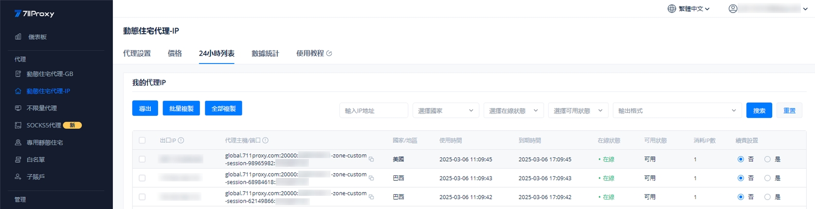 5. 到期時間:從IP提取使用的開始時間起,6小時後到期(但仍會在24小時列表中)。
