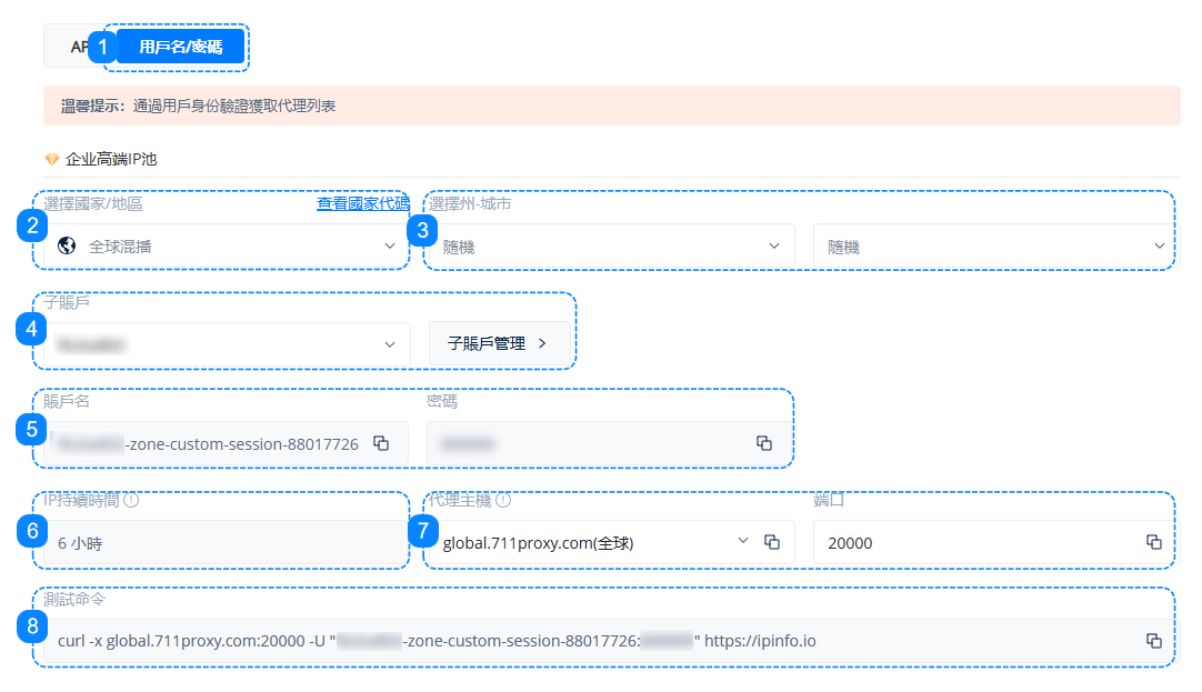 5.這裏顯示的是您選擇的子賬戶對應的用戶名和密碼信息,用於訪問代理的身份憑證。