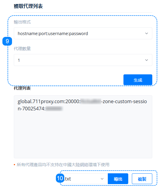9. 這裡是必不可少的一步,在右側的“獲取代理列表”部分,設置適合我們目標的正確格式以及需要的代理數量,單擊“生成”按鈕後,我們可以在代理列表看到反映上述選擇的具體信息,您可以在代理字符串頁面上了解更多信息。