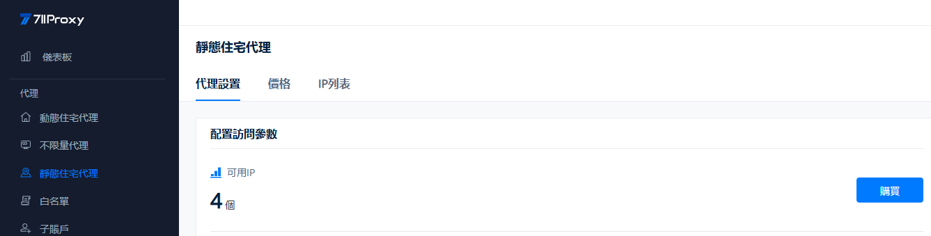 若要配置代理,請導航至儀表板上的靜態住宅代理 > 代理設置部分。可用IP部分顯示您當前有效期內可以使用的 IP。