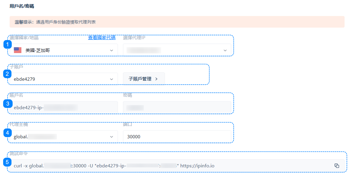 3. 這裏顯示的是您選擇的子賬戶對應的用戶名和密碼信息,用於訪問代理的身份憑證。
