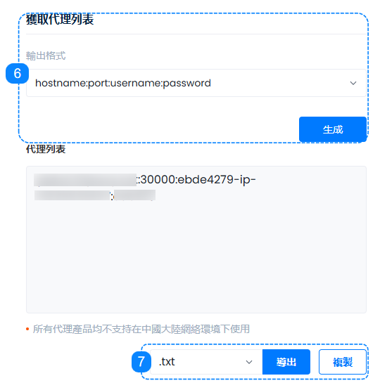 7. 一旦您配置了代理,您就可以開始使用它們了。在這裏可以將創建的代理字符串複製到剪貼板,或者下載爲 .TXT 文件或者 .CSV 文件,您可以將此應用於任何應用程序或工具。