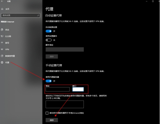 3.進入“網絡和Internet”頁面後,點擊左側“代理”,然後在對應頁面中,啟動“使用代理服務器”按鈕,輸入地址和端口,點擊“確定”保存更改。