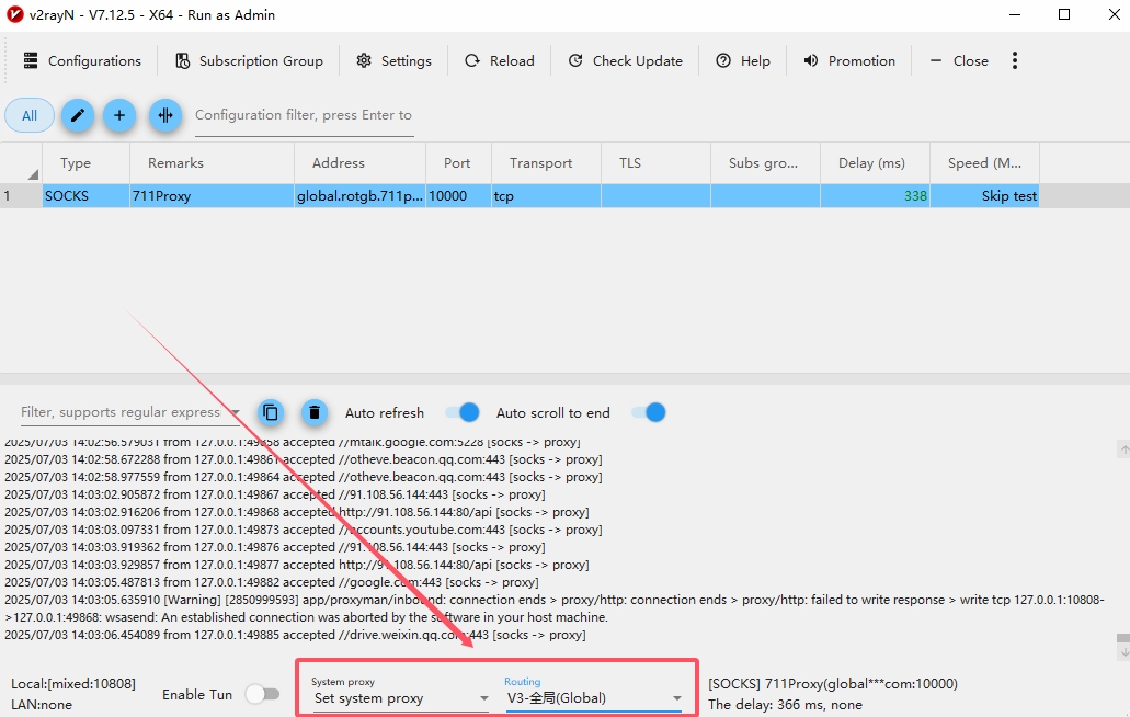 5. 設置配置的節點為活動服務器,開啟自動配置系統代理并打開全局模式。完成后即可正常使用代理了