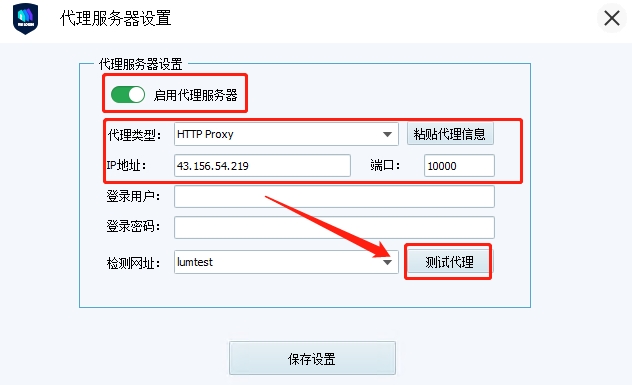 3.打開代理服務器按鈕,選擇代理類型,以API提取為例,輸入從711Proxy複製的主機和端口,若是賬密認證模式,還需要填寫登錄用戶和登錄密碼,最後單擊“測試代理”,檢測成功後保存即可開始使用