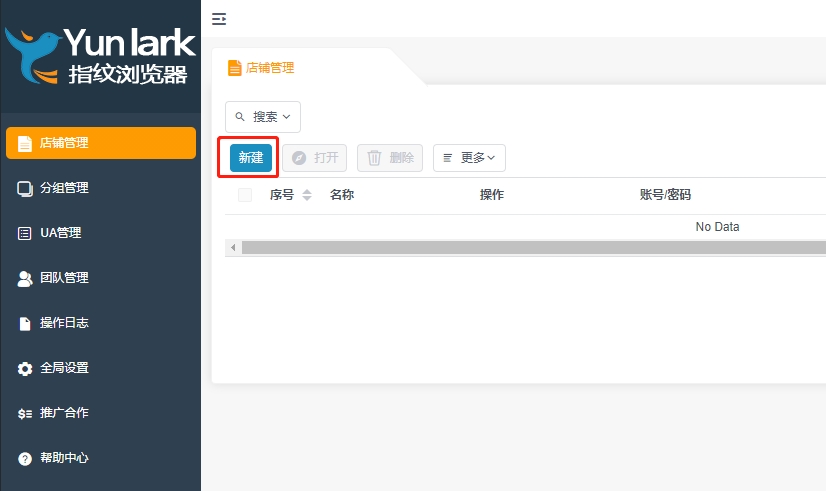 1.打開Yunlark ,在【店鋪管理】板塊點選【新建】