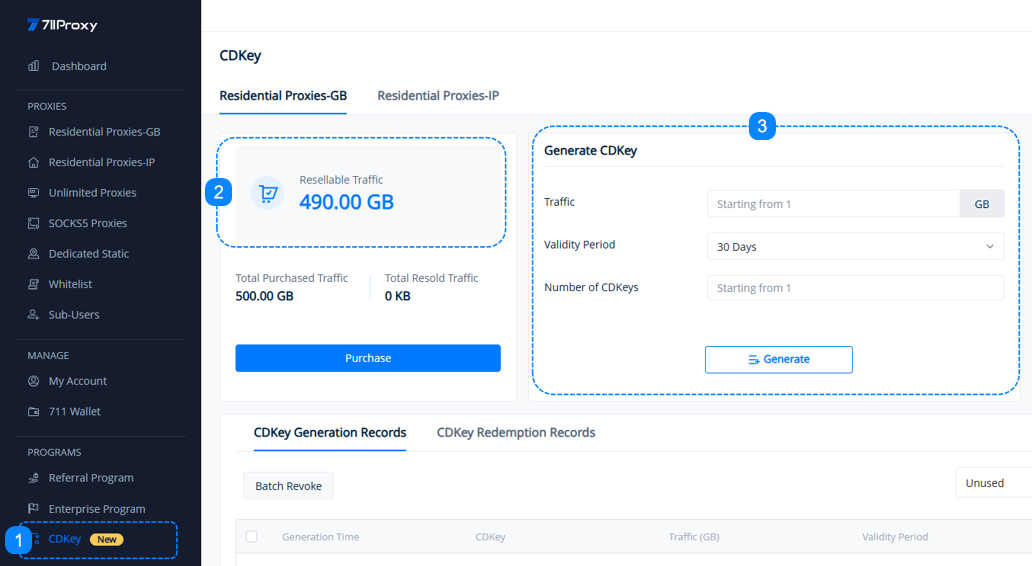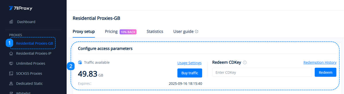 How to redeem a CDKey? Using data as an example: click ① Residential Proxies, then enter the CDKey in section ② and click Redeem. The corresponding GB amount will be added to your available traffic balance. If it doesn't update immediately, simply refresh the page.