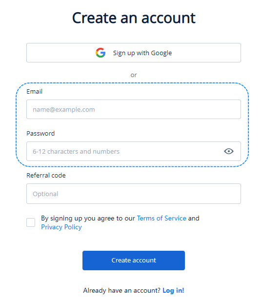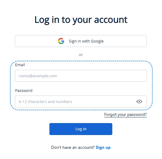On the login page, enter your registered email and password, click on the Log in button or choose to "Log in with Google".