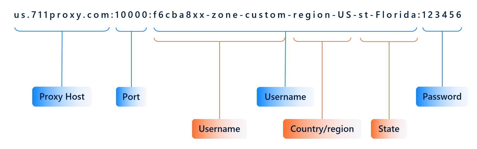 711Proxy utilizes the "username" part of the string to configure specific parameters. For example, a proxy string for Florida, the US:
