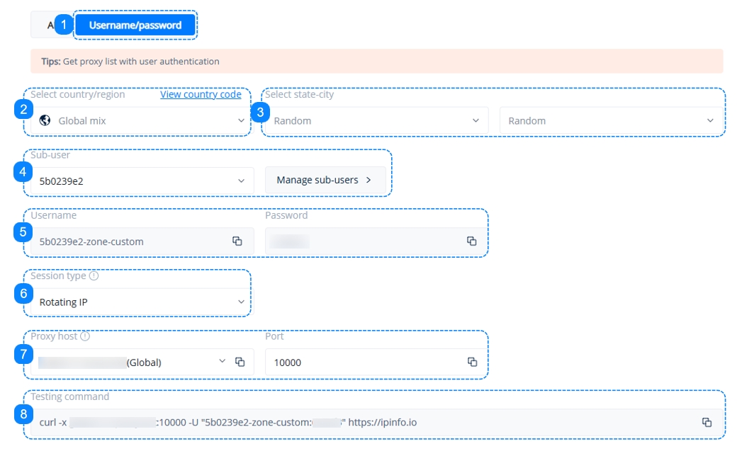 Here you will find the username and password information for your chosen sub-user, these are the credentials that you will use to access your proxies.