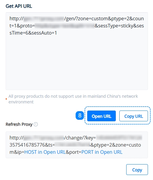 8. After the URL is generated, you may choose to copy the URL or open the URL, which will show you a list of generated proxies once opened. You may learn more on the API URL page.