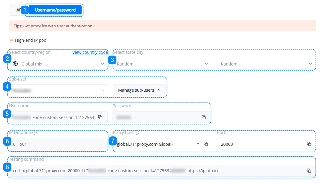 5. Here you will find the username and password information for your chosen sub-user, these are the credentials that you will use to access your proxies.