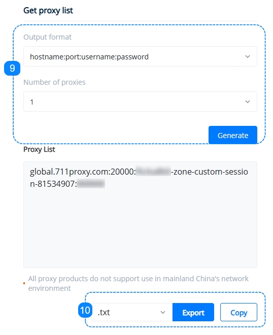 9. Here comes the essential step, on the right-hand side under "Get Proxy List", set up the correct format that suits our target as well as the number of proxies needed, after clicking the "Generate" button, we can see the specifics reflecting the selections made above in the Proxy List, you may learn more on the Proxy String page.