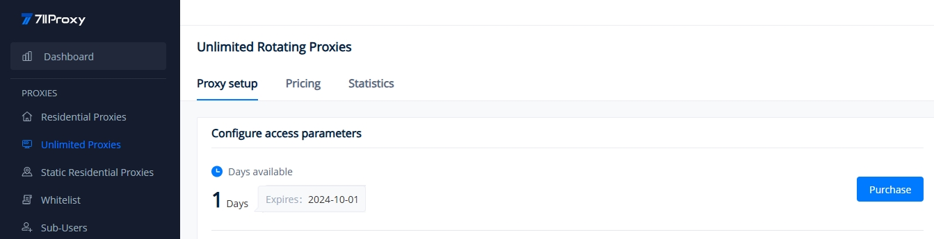 To configure your proxies, kindly navigate to the Unlimited Proxies > Proxy Setup section of your dashboard. Here you can view your current available hours or days.