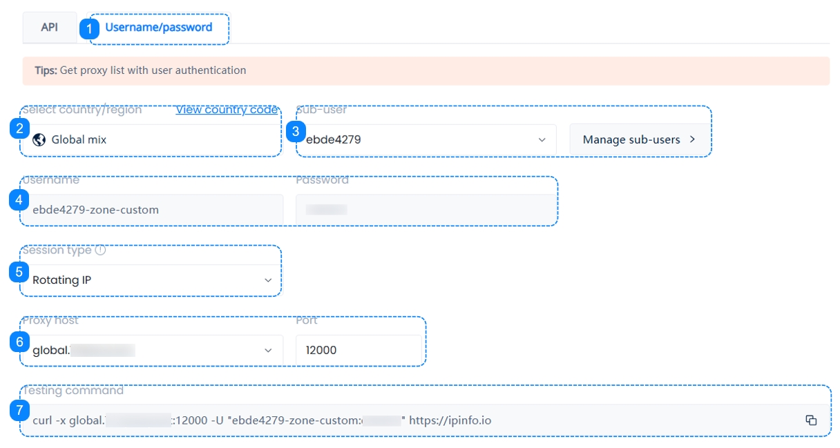 4. Here you will find the username and password information for your chosen sub-user, these are the credentials that you will use to access your proxies.