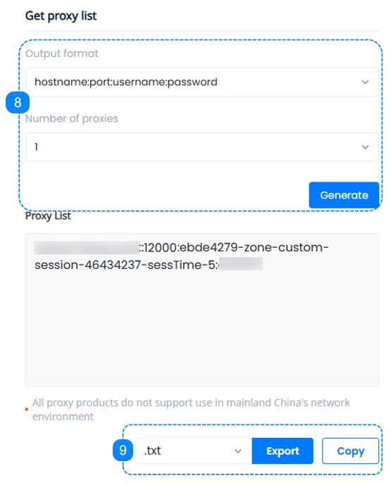 8. Here comes the essential step, on the right-hand side under "Get Proxy List", set up the correct format that suits our target as well as the number of proxies needed, after clicking the "Generate" button, we can see the specifics reflecting the selections made above in the Proxy List, you may learn more on the Proxy String page.