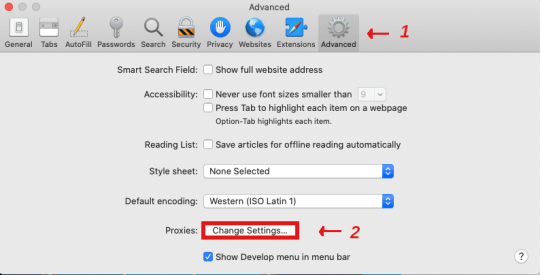 2. Click the "Advanced" button on the right side of the menu bar, then at the bottom of the page, click "Change Settings" next to Proxies.