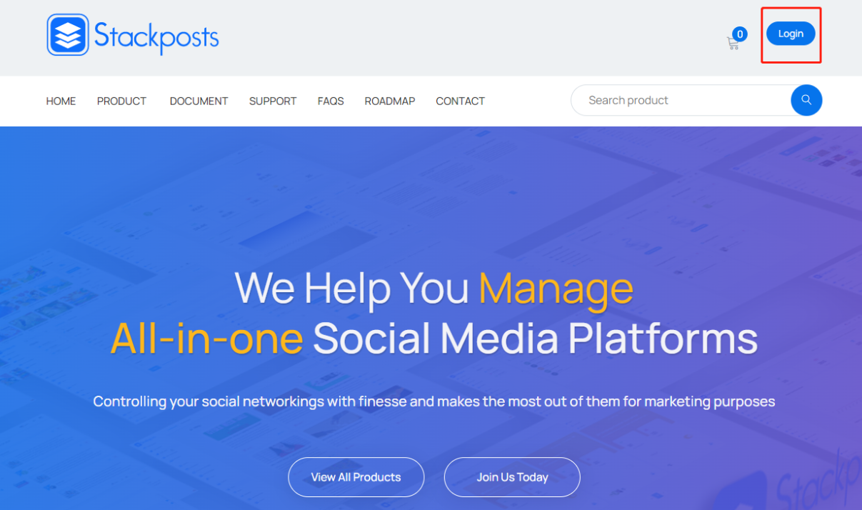 1. Open the Stackposts home page and click the Login button. Enter your username password and go to the Dashboard